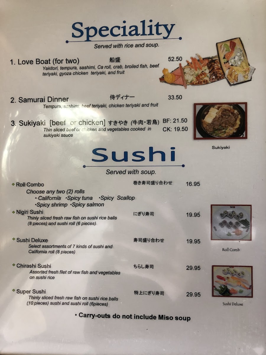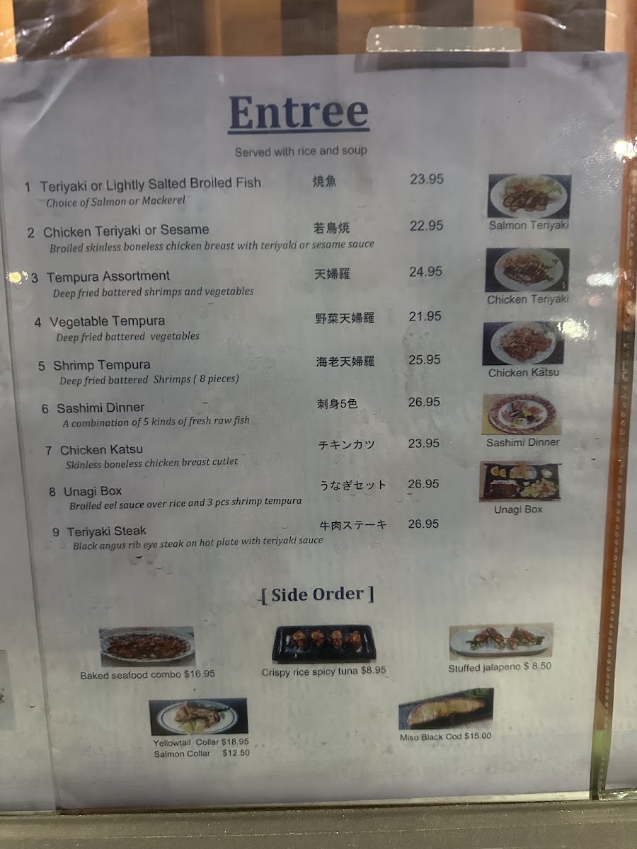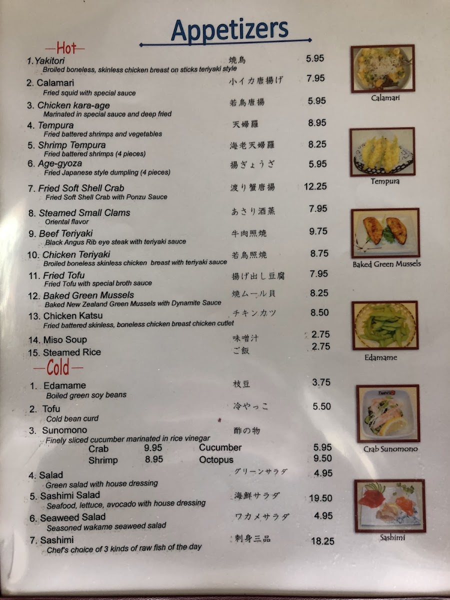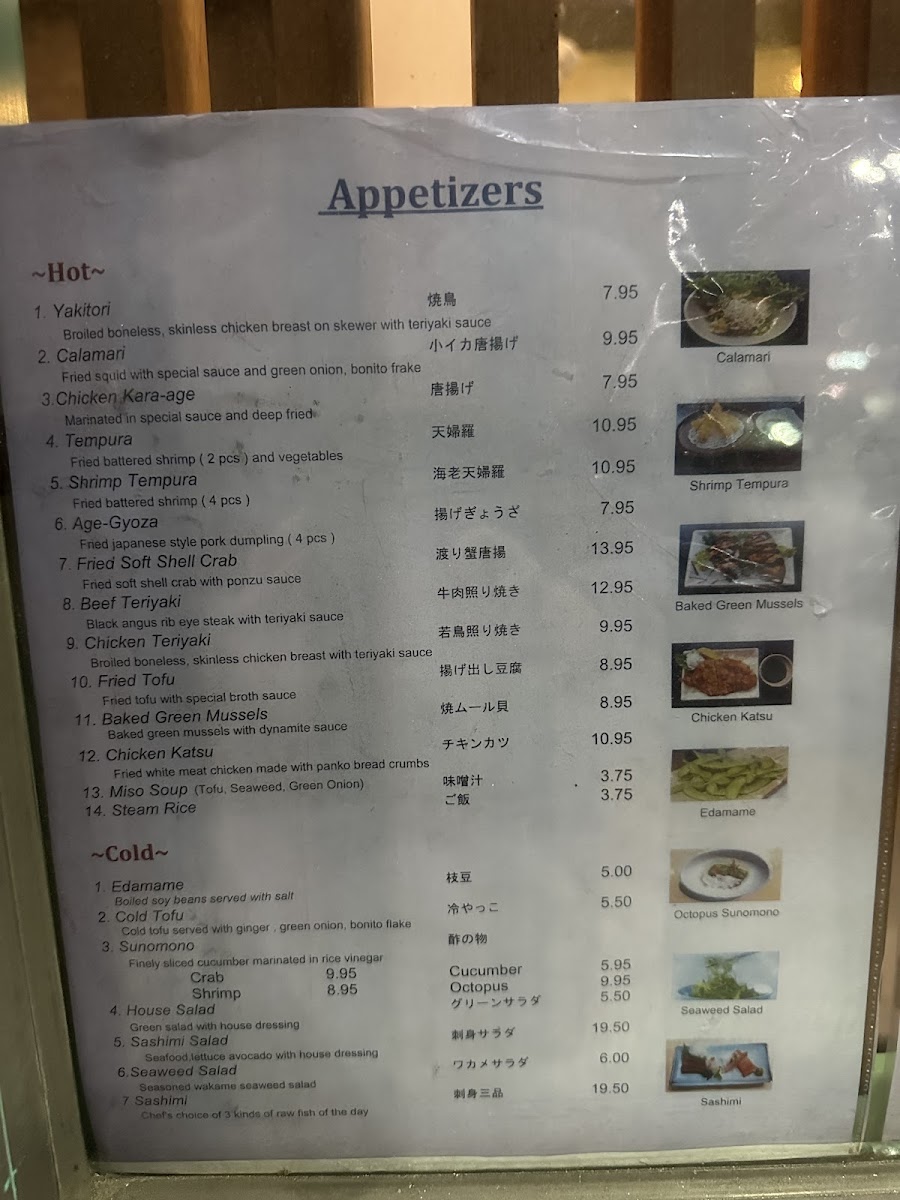 Additionally, the menu features a range of appetizers and other items to complement your meal, including Yakitori, Calamari, Chicken Kara-Age Tempura, and Age-Gyoza. These smaller dishes provide a fantastic opportunity to share and explore different textures and flavors.