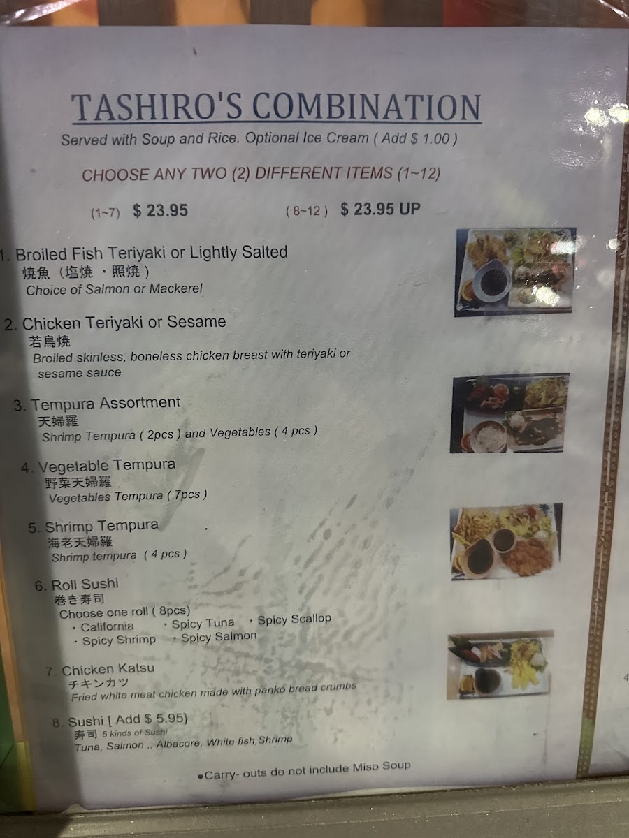 For something more substantial, the Tashiro's Combination is a great pick, featuring a variety of broiled dishes. You can choose from Broiled Fish Teriyaki or Lightly Salted Fish, Chicken Teriyaki or Sesame Chicken, and a selection of Vegetable Tempura or Shrimp Tempura, making it an excellent way to sample multiple flavors in one meal.